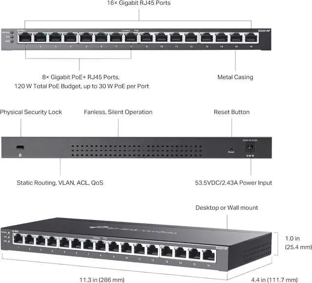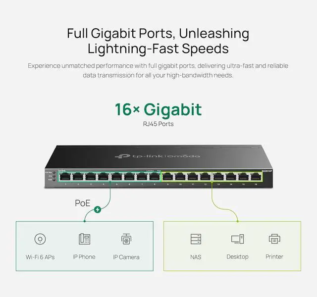 Flexible Full Gigabit 16-Port Port Configuration8× PoE+ (802.3at/af) 10/100/1000 Mbps RJ45 ports providing up to 30W per port and total PoE power budget of 120W, together w/ 8x Gigabit Non-PoE Ports for high-speed connections.