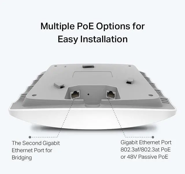 Multiple PoE Options for Easy Installation EAP245 supports both 802.3af/at PoE and Passive PoE power supply, can be either powered by a PoE switch or the provided PoE adapter, making deployment effortless and flexible.
