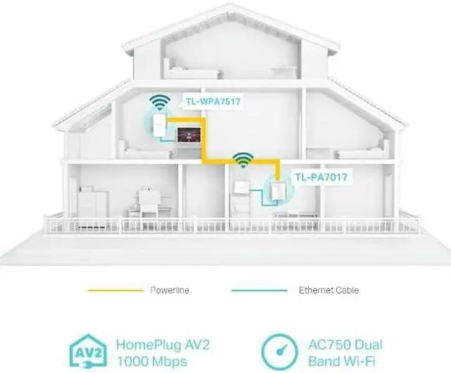 Homeplug AV2 Standard Compliant Powerline Adapter - Provides up to 1000Mbps Ethernet over power and up to dual band Wi-Fi. Ideal to be an Ethernet extender which can easily go over walls