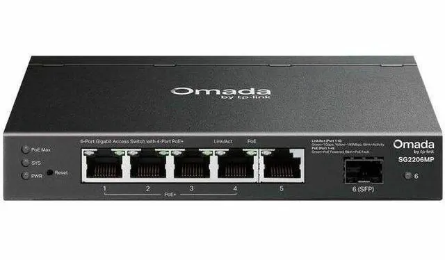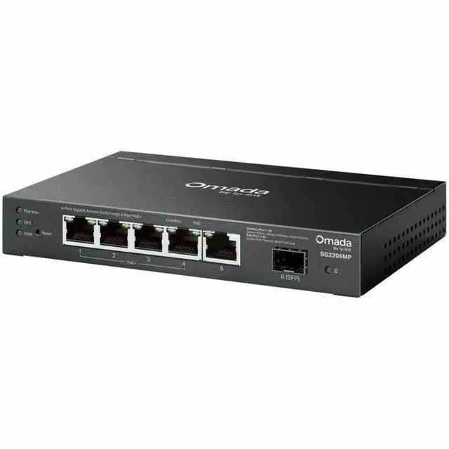 OmadaAccess6-Port Gigabit PoE+ Switch5? Gigabit Ports (4? PoE+), 1? SFP Slot63W Total PoE BudgetFanless Design for Silent OperationCentralized ManagementTraffic SeparationAccess ControlStatic Routing Omada AppPower over Ethernet, Flexible Network Deployment4? Gigabit PoE+ RJ45 PortsUp to 30W per PoE+ PortTotal 63W PoE Power BudgetCompatible with 802.3 af/at PoE and non-PoE devicesAccess PointIPPhoneIPCameraGateway/AggregationSwitchSoftware Defined Networking (SDN) with Cloud AccessMultiple Application ScenariosWi-Fi Coverage Works with Access PointsSurveillance Works with IP CamerasConference Call Works with IP PhonesWired Connections Works with Non-PoE Devices such as PCs and Printers