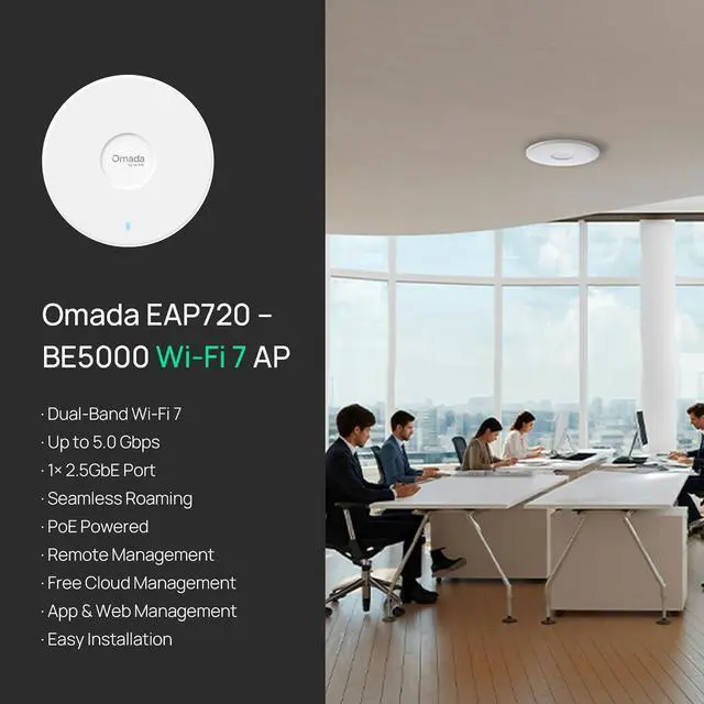 The TP-Link Omada EAP720 is a high-performance Wi-Fi 7 ceiling-mount access point, ideal for businesses. It delivers a total speed of up to 5.0 Gbps across dual bands (4324 Mbps on 5GHz, 688 Mbps on 2.4GHz) using advanced technologies like 4K-QAM and 240MHz bandwidth.