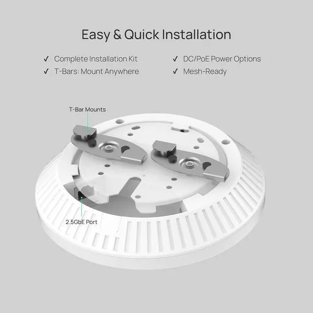 Supporting over 250 concurrent devices, it ensures reliable connectivity in offices or public spaces. With a 2.5G Ethernet port, it boosts wired backhaul. Flexible deployment options include PoE (802.3at) or DC power, plus easy ceiling/wall mounting.