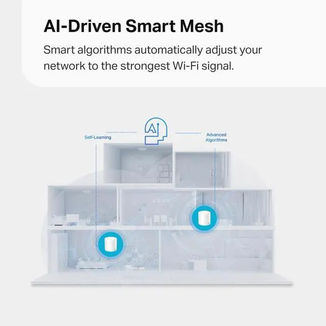 In addition, it automatically learns and self-improves withAI-Driven Mesh to provide a unique and ideal Mesh WiFi for your home. Walk fromroom to room and enjoy seamless streaming at the fastest possible speeds.