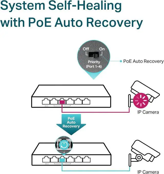 PoE Auto Recovery guarantees stable operation of PoE devices by automatically restarting the dropped or unresponsive PD devices, plug and play, no configuration and installation required
