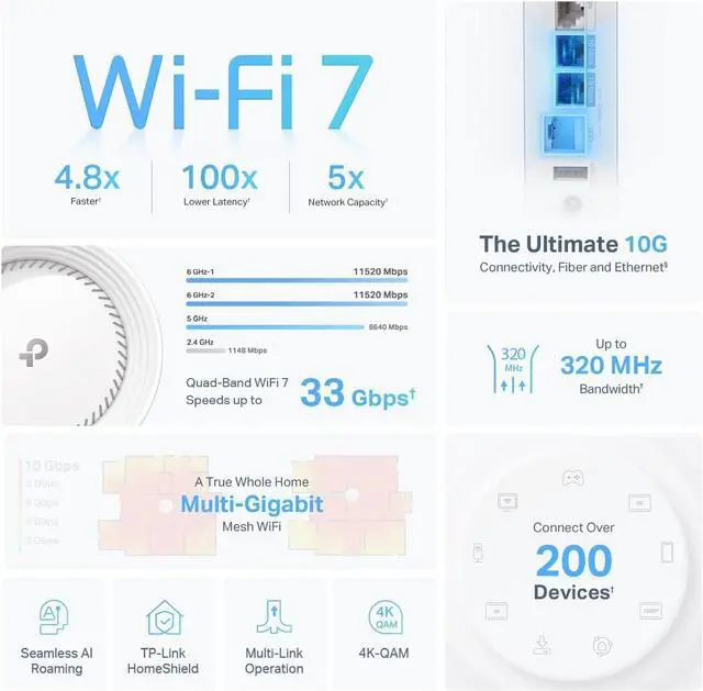 BE33000 Quad-Band Wi-Fi 7 Mesh: Deco 7 Elite BE95 is designed with the latest Wi-Fi 7 technology, featuring Multi-Link Operation, Multi-RUs, 4K-QAM, and 320 MHz channels. With speeds of 11520 Mbps on the 6GHz band 1, 11520 Mbps on the 6GHz band 2, 8640 Mbps on the 5GHz band, and 1148 Mbps on the 2.4GHz band, the 1 pack mesh connects over 200 devices without dragging down performance and delivers unparalleled Wi-Fi performance.