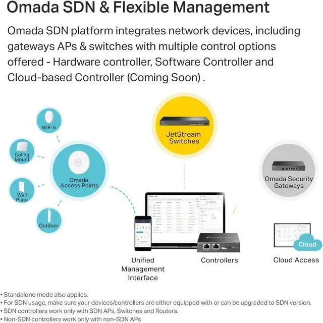 Integrated into Omada SDNOmada's Software Defined Networking (SDN) platform integrates network devices including access points, switches & gateways with multiple control options offered - Omada Hardware controller, Omada Software Controller or Omada cloud-based controller*(Contact TP-Link for Cloud-Based Controller Plan Details). Standalone mode also applies.