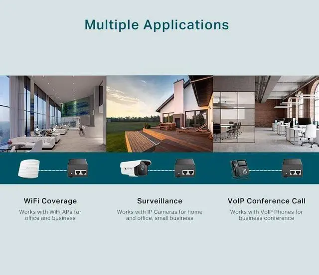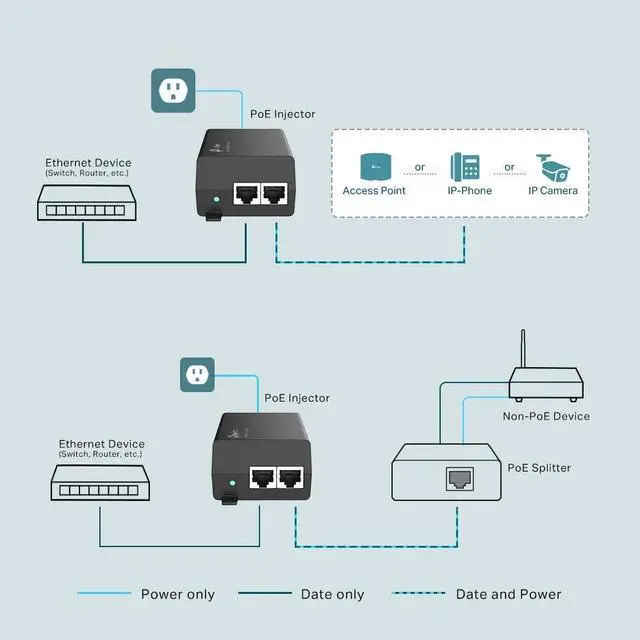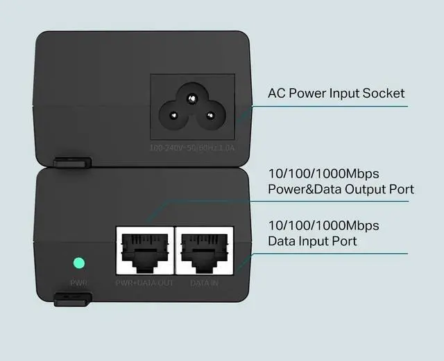 The TP-Link TL-POE160S PoE+ Injector fully complies with IEEE 802.3af/at standards, and can work with all IEEE 802.3af/at PoE compliant PDs (Powered Devices) or PoE Receiver Adapters, such as TP-Link's TL-POE10R, or other equivalent product, to expand your network to where there are no power line or outlet, where you wish to fix device such as AP, IP Camera or IP Phone, etc.