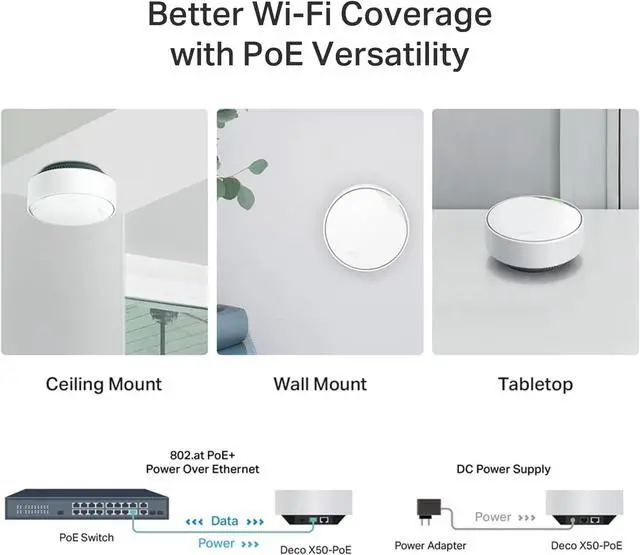 More Versatility with PoE Power Deco units via PoE+ or a standard power plug. Use a PoE+ switch (not included) to create a multi-Gig backhaul between routers and install Deco in more places, including ceilings, for stronger Wi-Fi coverage.