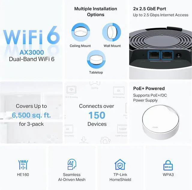 No More Buffering or Dead Zones - With coverage up to 6,500 sq.ft and connections for up to 150 devices, the Deco X50-PoE provides seamless, high-performance WiFi 6, eliminating buffering and dead zones¹