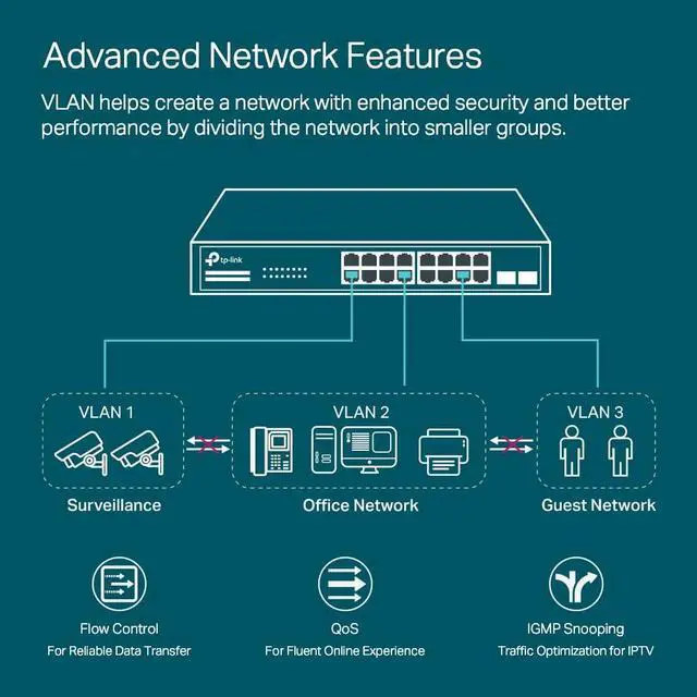 [Traffic Management Features] Supports Static Routing, QoS, IGMP Snooping, Link Aggregation, and Flow Control for network traffic management.