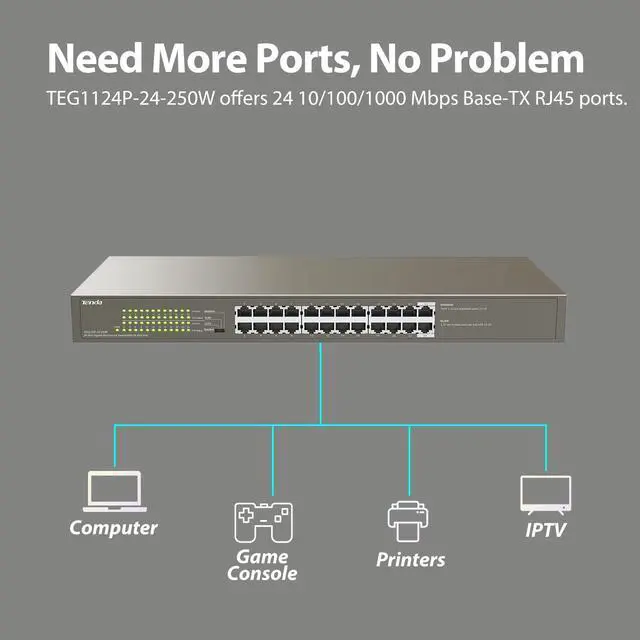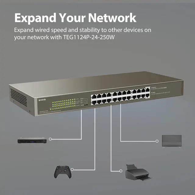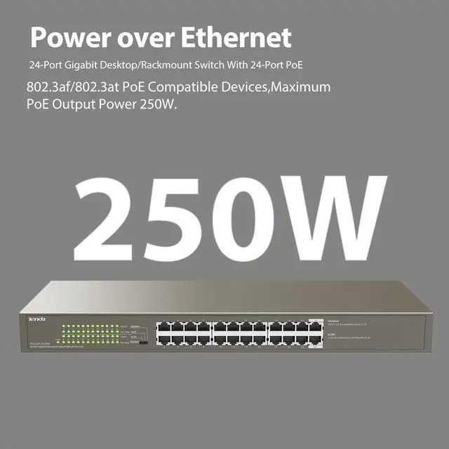 250W PoE Power Supply- Delivers a combined PoE power output of 135W, with 30W connections to each port, to supply power and exchange data to WiFi Access Points and IP Cameras