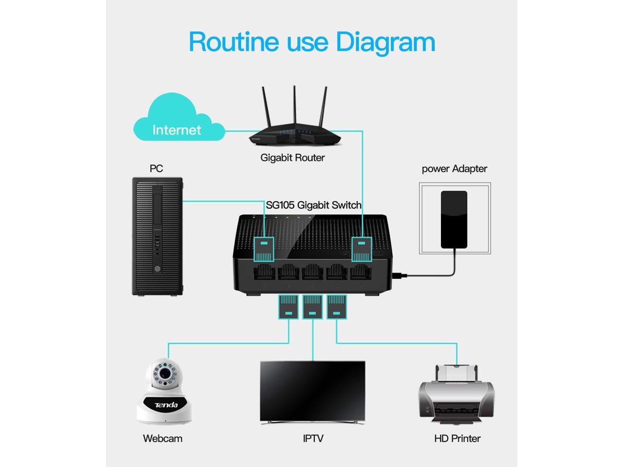 - 5 Ports GIGABIT ETHERNET 5 10/100/1000 Mbps Gigabit auto negotiation RJ45 ports greatly expand network capacity.