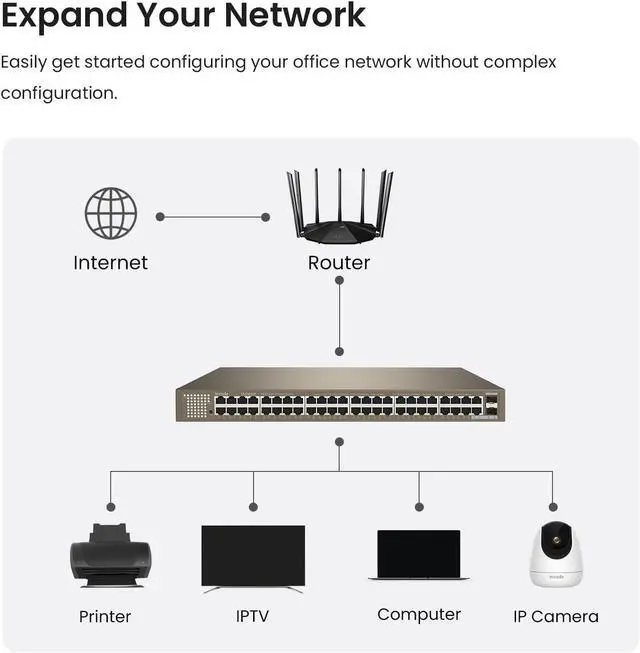 & : Fanless design ensures silent operation while consuming less than 48 W power, making it an eco-friendly and efficient networking solution