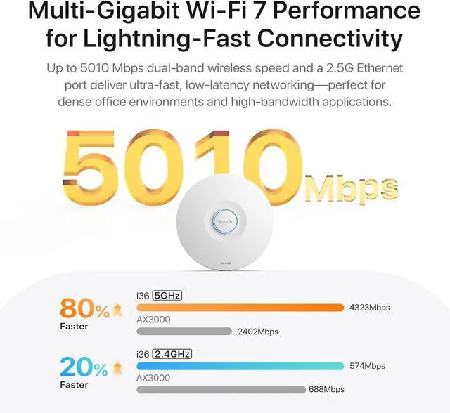 Next-Gen Wi-Fi 7 Performance Dual-band BE5010 speeds up to 5010 Mbps with 4096-QAM, 160 MHz bandwidth, and MU-MIMO technology for ultra-fast, stable wireless connectivity.