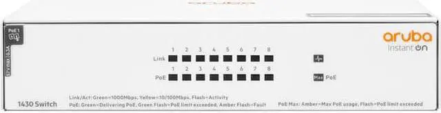 SwitchMarketing Information: Aruba Instant On 1430 Switch SeriesTechnology brings new revenue opportunities, more effective communication, and improved productivity to businesses of all sizes. Yet it also poses daily challenges of configuration and maintenance, especially for small businesses who lack IT support. Small offices and home offices need reliable network connectivity that's fast, configuration-free, and affordable for even the most budgetstrapped businesses. The Aruba Instant On 1430 Switch Series is a plug-and-play unmanaged switch series for small businesses looking for simple, reliable, and low-cost network connectivity. These easy-to-use switches deliver Layer 2 Gigabit Ethernet switching capabilities - at an affordable price point - to help connect and share common resources like printers and access points, without any complicated network configuration. With plug-and-play operation, fully automated functions, zero ongoing maintenance, and Power over Ethernet (PoE) models, these switches deliver simple, reliable connectivity for the smallest SMBs and home offices. The Aruba Instant On 1430 Switch Series includes seven switches in