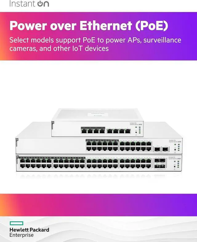 VERSATILE SMART-MANAGED SWITCH: The Instant On 1830 24G 2SFP PoE switch is a smart-managed, easy-to-deploy Layer 2 gigabit Ethernet switch with fast set-up, easy management, and security designed for small businesses with evolving network demands. Features 195W of Class 4 Power over Ethernet (PoE) on 12 ports to power access points, IP phones and security cameras