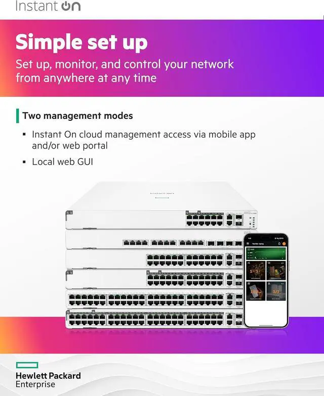EASY SET UP AND MANAGEMENT: Set up, manage, and monitor your Instant On switches and access points from any device using the Instant On mobile app or web browser no subscription required. Guided step-by-step instructions to install devices and get your network up and running quickly no technical expertise required. Stack up to four 1960 switches with Local Stacking and Cloud-Managed Stacking (using the Instant On mobile app or cloud-based web portal)