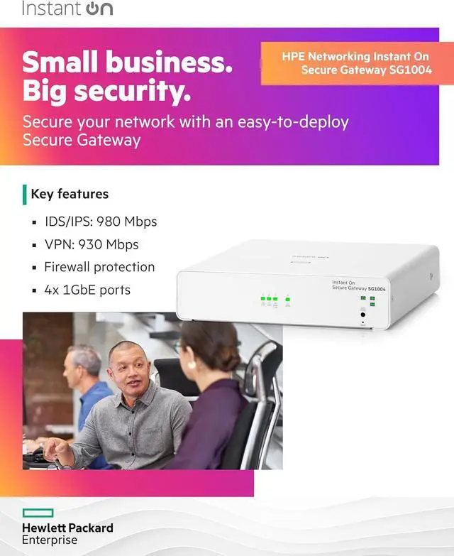 The Instant On Secure Gateway SG1004 is a great device for small and medium businesses to safeguard their business network from external threats. Support for up to 940Mbps of network throughput is achieved with hardware acceleration and all security settings in active mode. Ideal for smaller footprints or lower ISP bandwidth, the SG1004 keeps your employees, business, and customers safe from cyber threats.
