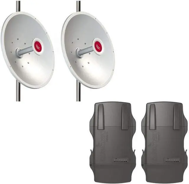 NetMETAL 5 (RB922UAGS-5HPacD-NM) Mikrotik RB922UAGS-5HPacD-NM version is equipped with a miniPCI-express slot a SIM slot for 3G/4G device or additional wireless card, a high power 2x2 dual chain 802.11ac wireless and two RP-SMA connectors for external antennas. The NetMETAL 5 is a completely new 802.11ac product in a waterproof metal enclosure. Its rugged design is made to withstand the toughest conditions, but at the same time is easy to use and can be opened and closed with one hand. The solid aluminum enclosure also works as a reliable heat-sink for its high output power radio. The NetMETAL is equipped with powerful 720Mhz CPU, 128MB RAM, one Gigabit Ethernet port, 802.11ac wireless, one SFP cage, USB, RP-SMA connectors for external antennas and RouterOS L4 license. mANT30-PA (MTAD-5G-30D3-PA) mANT30 is a professional class 5 GHz 30dBi dish antenna, built to the highest industry standards. Built to seamlessly accomodate our Basebox series products, but can be used for any pole mounted wireless device due to the adequate length of the included FlexGuide cable. Two antennas are available, with a standard type mount (MTAD-5G-30D3), and with a precision alignment mount (MTAD-5G-30D3-PA). The antennas come packaged with all necessary accessories and cables. Note: Basebox wireless device pictured for illustrative purposes.