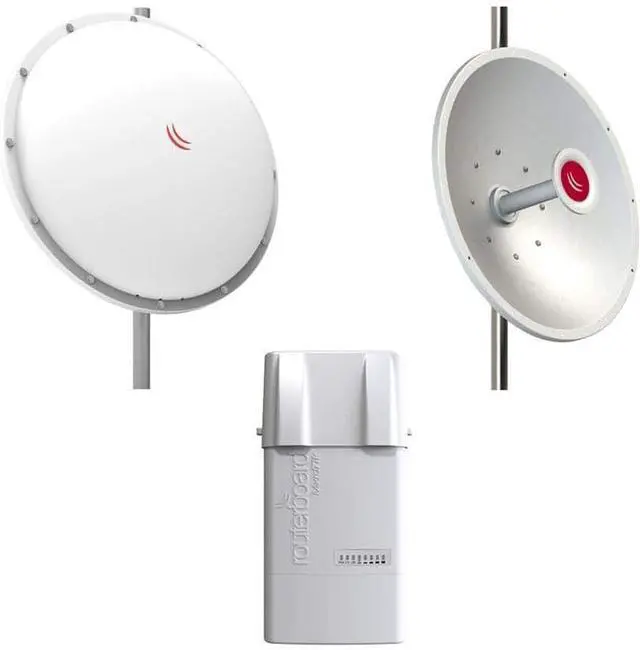 NetBox 5 (RB911G-5HPacD-NB) The NetBox 5 is a dual chain outdoor client device with RP-SMA connectors for antennas, and a cable hood for protection against moisture. This device supports the new 802.11a/n/ac standard for increased wireless speed (866Mbit datarate, and 20/40/80MHz channels). The case can be opened with one hand, and is protected against the elements. Ethernet and a Grounding wire exits are provided on the bottom, behind a protective door. Comes with a mounting loop for tower/pole mounting, and a separate DIN rail mount is also provided. Package also includes a PoE injector and power supply unit. mANT30 PA (MTAD-5G-30D3-PA) mANT30 is a professional class 5 GHz 30dBi dish antenna, built to the highest industry standards. Built to seamlessly accomodate our Basebox series products, but can be used for any pole mounted wireless device due to the adequate length of the included FlexGuide cable. MTRADC It reduces wind load, protects reflector surfaces from harsh environment, protects the antenna feed from falling objects, as well as positively affects the antenna sustainability and operational life. It's made from a special material that has a low dielectric constant. Wide range of temperature and direct sunlight won't affect it.