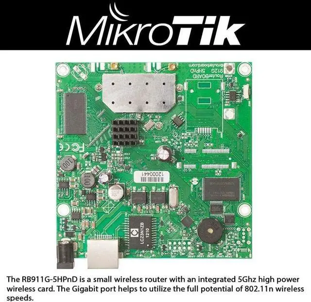 The RB911G-5HPnD is a small wireless router with an integrated 5Ghz high power wireless card. The Gigabit port helps to utilize the full potential of 802.11n wireless speeds. It has built in 16kV ESD protection on both the Ethernet and the MMCX ports.