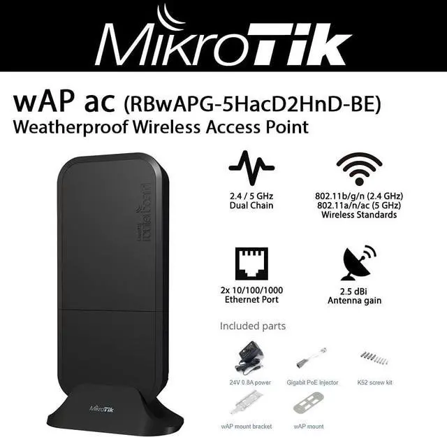 The wAP ac also known as RBwAPG-5HacD2HnD-BE (black version) US Version is a small weatherproof wireless access point for your mobile devices, perfect for installation outside your house, in the garden, on your porch, or anywhere else where you need it