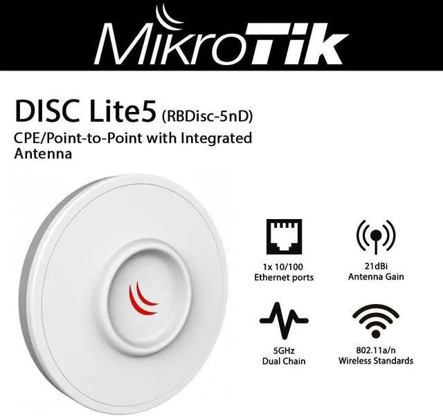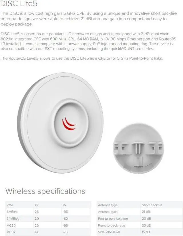 • Mikrotik DISC Lite5 US version is an integrated 21dBi Dual Chain 802.11n CPE with a 600MHz CPU, 64MB RAM, 1x 10/100Mbps Ethernet port and RouterOS L3 installed