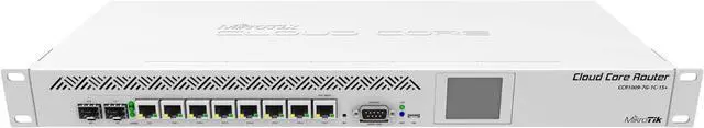 Comes with 1U rackmount, 7x Gigabit Ethernet, 1x Combo port (SFP or Gigabit Ethernet), 1xSFP+ cage, 9 cores x 1.2GHz CPU, 2GB RAM, LCD panel, Dual Power supplies, SmartCard slot, RouterOS L6