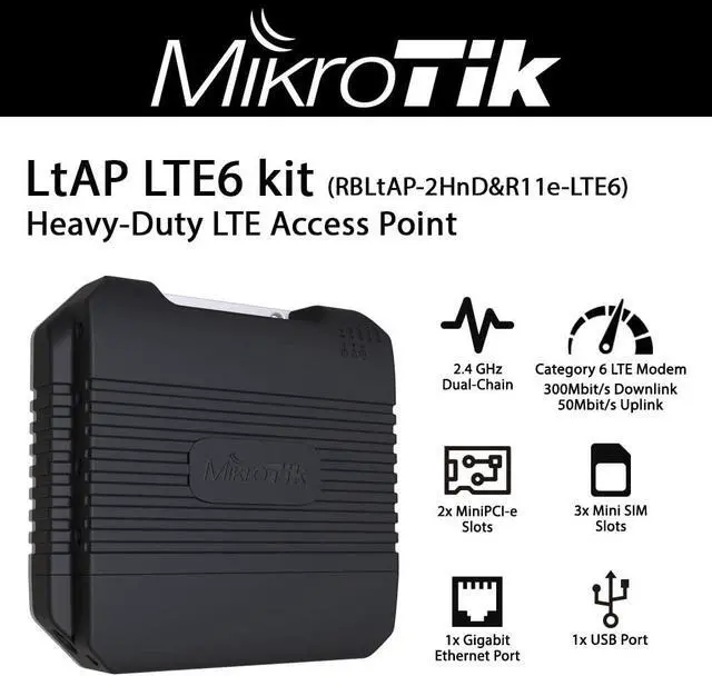LtAP LTE6 kit also known as RBLtAP-2HnD&R11e-LTE6 is a compact 4G (LTE) capable weatherproof wireless access point perfect for busy urban environment or off-the-grid outdoors networking