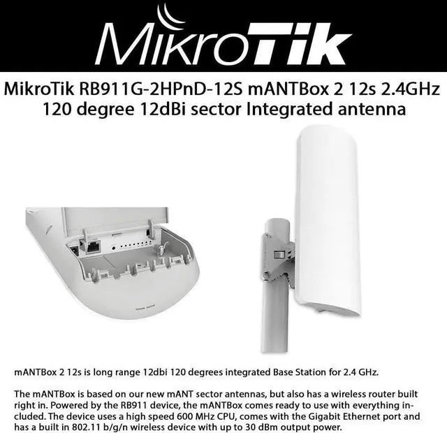 • Mikrotik mANTBox 2 12s: 2.4GHz 120 degree 12dBi dual polarization sector Integrated antenna with 600Mhz CPU, 64MB RAM, Gigabit Ethernet, PSU and PoE.