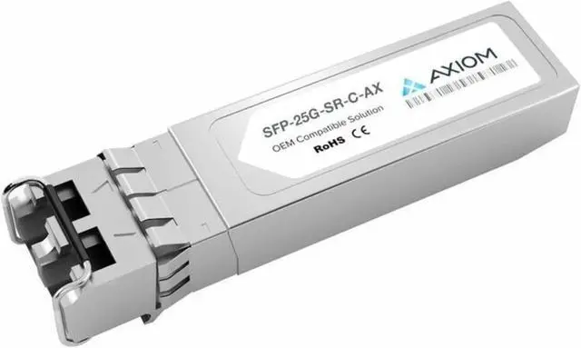 Axiom SFP28 25Gb Transceiver Modules are 100% compatible in all OEM applications. They are pre-configured with an application specific code to meet the requirement set forth by the router and switch OEMs. Axiom compatible transceivers perform, fit and function identically when compared to Original Transceivers. Axiom brand transceivers also function with other brands within the same network. 100% Guaranteed Compatibility in all OEM applications Part number and unique product serialization; Eliminates any network communication conflicts and provides easy identification Fully compliant with the multi-sourcing agreement (MSA) which enables them to work in all MSA compliant platformsOriginal Equipment Manufacturer (OEM) names may be registered trademarks of the respective OEM, and the OEM has neither authorized nor sponsored the use of its trademark or trade name. All OEM names are used for comparative purposes only.