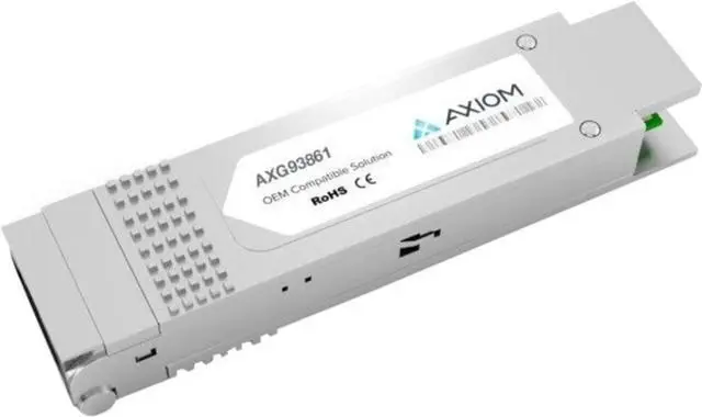 Axiom QSFP+ Transceiver Modules are 100% compatible in all OEM applications They are pre-configured with an application specific code to meet the requirement set forth by the router and switch OEMs Axiom compatible transceivers perform fit and function identically when compared to Original Transceivers Axiom brand transceivers also function with other brands within the same network 100% Compatibility in all OEM applications Part number and unique product serialization Eliminates any network communication conflicts and provides easy identification Fully compliant with the multi-sourcing agreement (MSA) which enables them to work in all MSA compliant platforms Application/Usage Optical Network Application/Usage Data Networking Product Type QSFP+ Interfaces/Ports Details 1 x 40GBase-SR4 Product Type QSFP+ Compatibility MSA Compliant Manufacturer Part Number AXG93861 Interfaces/Ports Details 1 x LC 40GBase-SR4 Network Limited Lifetime Network Technology 40GBase-SR4 Manufacturer Axiom Memory Solutions Product Name Arista QSFP+ Module Network Technology 40GBase-SR4 Brand Name Axiom Brand Name Axiom Ethernet Technology 40 Gigabit Ethernet Media Type Supported Optical Fiber TAA Compliant Yes Yes Environmental Certification RoHS Ethernet Technology 40 Gigabit Ethernet Media Type Supported Optical Fiber Fiber Mode Supported Multi-mode TAA Compliant Yes