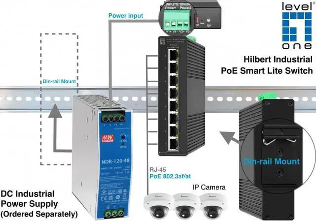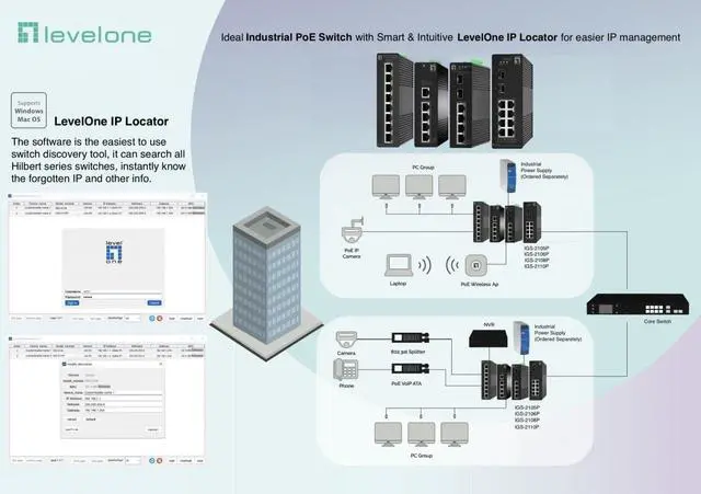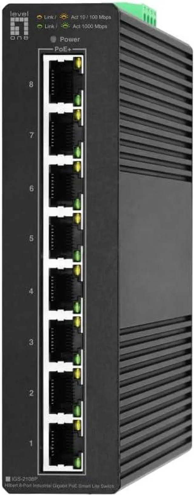 The Hilbert IGS-2108P 8-Port Gigabit PoE Smart Switch is a next-generation Ethernet switch that offers powerful PoE functionality and ease of use, and enables cost-effective Ethernet services via copper connections. The IGS-2108P offers 8 RJ45 ports (10M/100M/1G) including 8 PoE+ ports (802.3at/af compatibility). to enable high-speed networks in critical environments. With industrial standard DIN rail mounting and highly visible status LEDs, the switch offers simple monitoring of port connections. With the new LevelOne IP locator the simple Switch Discovery software, you can search all Hilbert series switches and view information about the switch and IP configuration. It is compatible with the most popular Windows and Mac operating systems.
