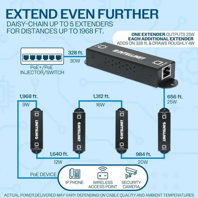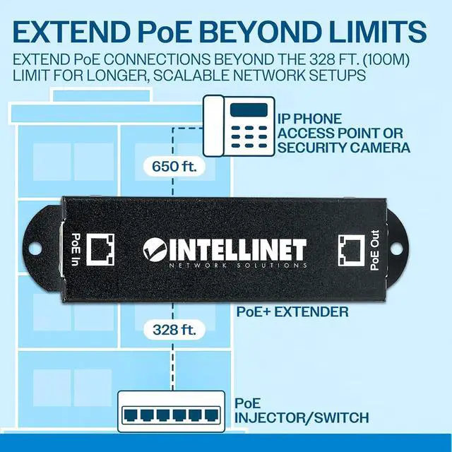 Extends an existing PoE connection beyond the 100m (328-ft.) limit. Covers longer distances by cascading multiple PoE extenders together.