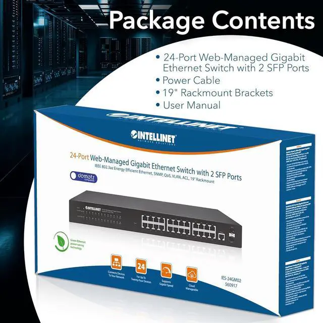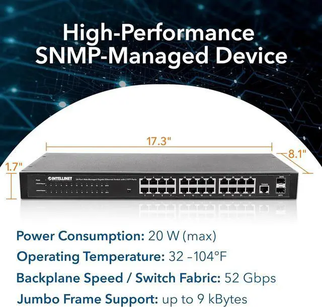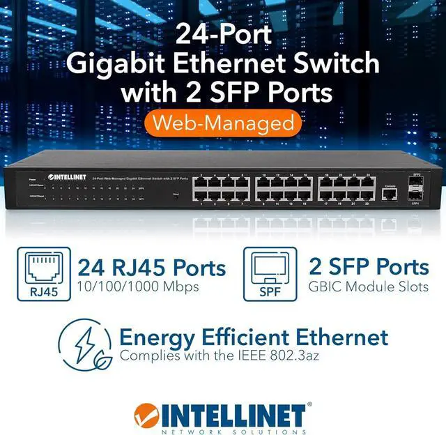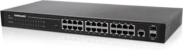 Intellinet 24 Port Web Managed Gigabit Ethernet Switch with 2 SFP Ports with 19" Rackmount Brackets, SNMP Management and Remote Monitoring, Metal Housing, Fanless & Quiet3 Yr Mfg Warranty-560917