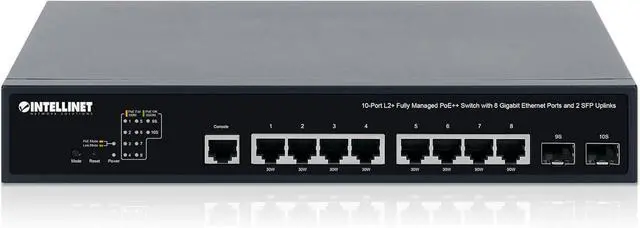10-port layout with fiber uplink options: Eight 10/100/1000 RJ45 PoE ports plus two 1G SFP slots for uplinks. Auto-MDIX and auto-negotiation on RJ45 ports to match connected equipment.