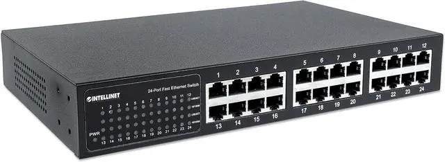The Intellinet Network Solutions 24-Port Fast Ethernet Switch is a high-performance 10/100 Mbps LAN switch with auto-sensing and auto-negotiation on every port. The space-saving, cost-effective design allows you to connect up to 24 devices to your local area network while only taking up one slot in your network rack or cabinet.