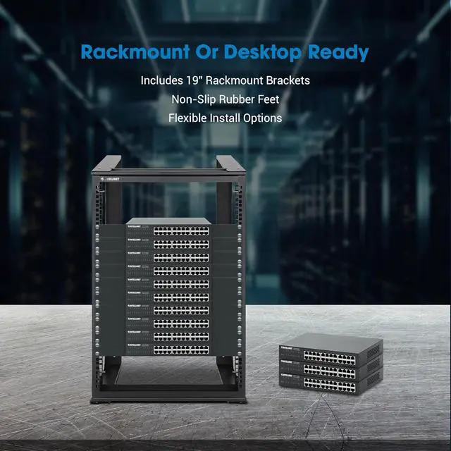 RACKMOUNT OPTION: Strong metal housing for maximum durability. 19" rackmount design with included rackmount brackets make it easy and quick to install the switch in your existing standard racks and cabinets. Includes rubber feet for non-slip placement on a desk or table.