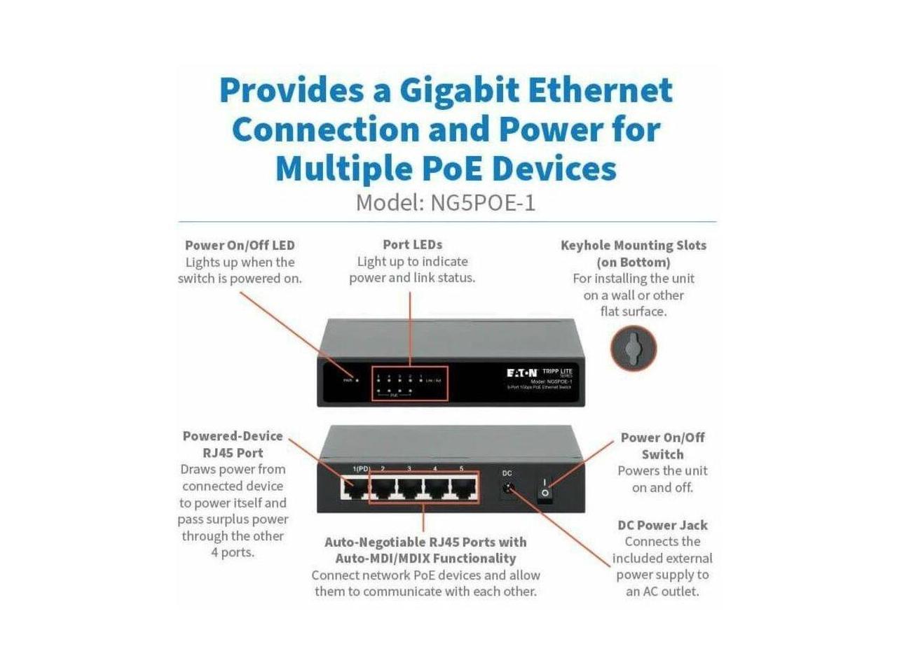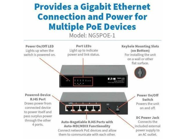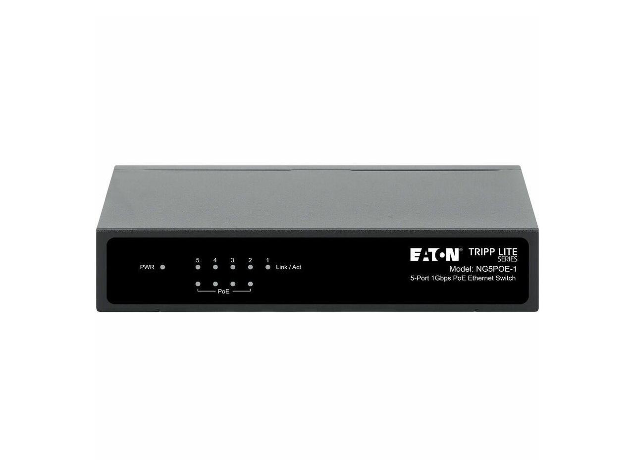 Eaton Tripp Lite Series 5-Port 10/100/1000 Mbps PoE-Powered Desktop Gigabit Ethernet Unmanaged Switch with PoE+ Pass-Through, 65W, Metal Enclosure - 5 Ports - Gigabit Ethernet - 10/100/1000Base-T - 2