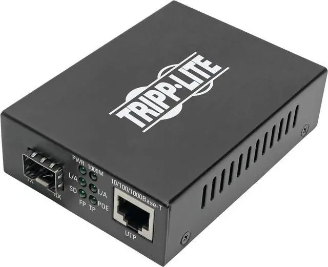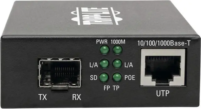 CUSTOMIZABLE MEDIA CONVERTER EXTENDS POWER AND DATA TO A POE+ DEVICE VIA FIBER CABLE: This economical unit converts a singlemode or multimode fiber optic signal to a copper Ethernet signal that extends both power (48 VDC) and 10/100/1000 Mbps Gigabit Ethernet up to 100 meters (328 feet) using Cat5e/6 cabling. The N785-INT-PSFP is ideal for providing power and data to PoE and PoE+ devices, such as security cameras, VoIP telephones, point-of-sale kiosks and access control devices. WORKS IN TANDEM WITH TRIPP LITE'S N785-SERIES (NON-POE) MEDIA CONVERTERS: The N785-INT-PSFP lets you choose a transceiver that suits your system, while also delivering power to your PoE+ device (Tripp Lite's N286-01GSX-MDLC and N286-01GLX-SLX transceivers sold separately). It connects to a Tripp Lite N785-Series non-PoE media converter using your choice of singlemode or multimode cabling. SUPPORTS POWER OVER ETHERNET TO SAVE YOU MONEY AND GIVE YOU MORE INSTALLATION CHOICES: PoE saves you the expense and effort of purchasing, connecting and installing individual power supplies for each device. It also helps you install PoE devices in areas far away from AC outlets, such as poles or ceilings. SUPPORTS AUTO-SENSING OF NETWORK SPEED AND OTHER ADVANCED FUNCTIONS: Monitoring and controlling your network nodes is easy with the N785-INT-PSFP's advanced features, such as automatic network speed sensing, full/half-duplex auto-detection and automatic MDI/MDIX configuration. Six LEDs indicate the converter's power, PoE, Ethernet network and fiber link statuses at a glance. Link fault pass through (LFP) monitors all ports to ensure link status remains active. COMPLETELY PLUG-AND-PLAY WITH NO ADDITIONAL SOFTWARE REQUIRED FOR CONNECTION: The compact metal converter is easy to install and set up with no software or drivers required. The included power supply comes with four international power cables (North America, Europe, United Kingdom, Australia) for connecting to an AC outlet with no computer or other signal source needed.