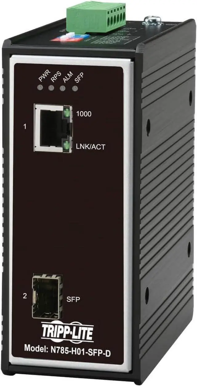 CUSTOMIZE A NETWORK EXTENSION OVER FIBER OPTIC CABLE: This network media converter works with a variety of SFP transceivers to convert a copper Gigabit Ethernet signal to fiber optic and extend it to a second network device. The customizable SFP port supports both singlemode and multimode transceivers, allowing your network connection to reach hubs, switches and other devices located farther away than copper cabling's 100-meter limit. Auto-negotiation and automatic MDI/MDI-X configuration seamlessly connect devices without crossover cabling. MONITOR YOUR INSTALLATION WITH LINK FAULT SIGNALING AND LOOP BACK FUNCTIONS: Determine the health of your network connection via the Link Fault Signaling (LFS) and Line Loop Back (LLB) functions. The LFS LED indicates when a copper or fiber cable has been severed or another cause of disruption in service has occurred. The LLB diagnostic test ensures copper and fiber cables have been correctly installed. Use the DIP switches to control each function or turn them on or off. LEDS INDICATE INSTALLATION PERFORMANCE AND DIAGNOSTIC FUNCTIONS: Easy-to-read LEDs on the side of the unit indicate essential status information, including network speed and connection, LFS diagnostics and unit power. The included 20-57VDC terminal block provides primary and secondary power inputs. PROTECTIVE METAL HOUSING BUILT TO WITHSTAND A VARIETY OF HAZARDS: The IP30 industrial-grade aluminum case is protected from entry by tools, wires and other solid objects greater than 2.5 millimeters in diameter. It can also operate in extreme temperatures ranging from -40 to 75 degrees Celsius (-40 to 167 degrees Fahrenheit). It is protected from electrostatic discharge (ESD), radio frequency interference (RFI) and power surges. Hardware is included for DIN mounting. TAA-COMPLIANT FOR GSA SCHEDULE PURCHASES: The N785-I01-SFP-D is compliant with the Federal Trade Agreements Act (TAA), which makes it eligible for GSA (General Services Administration) Schedule and other federal procurement contracts.