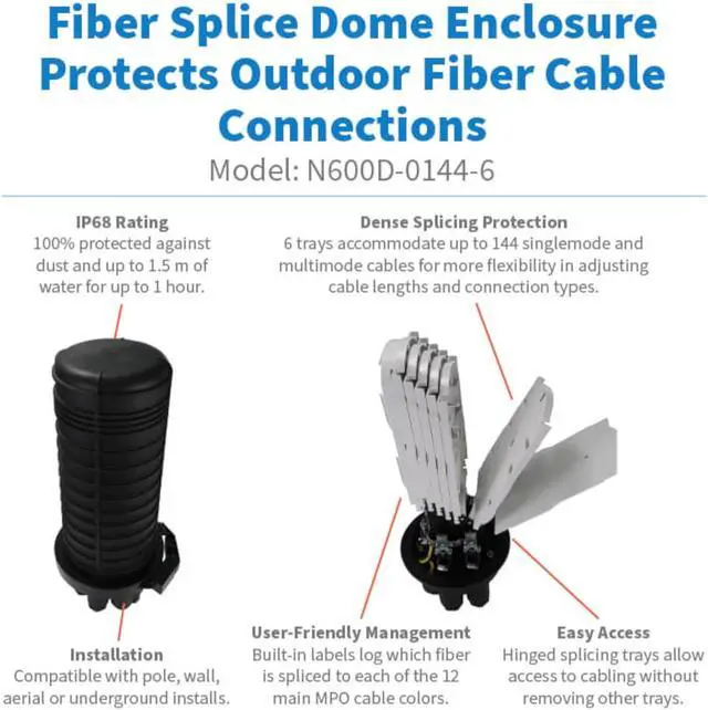 144 FIBER CAPACITY: Accommodates up to 24 unterminated cables or 144 splicing connections. Included tubing protects each splice point. Integrated ties keep cables secure. Recommended for FTTH/FTTP installations, including long underground fiber runs.