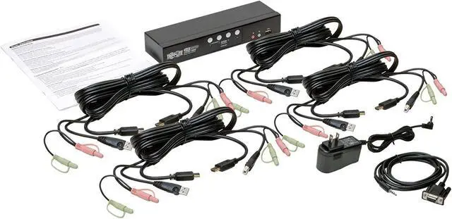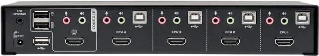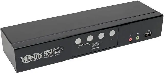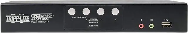 Connects 4 HDMI-enabled devices to a single HDMI monitor, keyboard and mouse This compact four-port KVM switch lets you access, control, Boot and reboot four computers or other devices with HDMI ports at the same time. In addition to desktop and notebook computers, The switch also connects up to four media centers, gaming systems, Blu-ray and DVD players, cable and satellite boxes and DVRs, and other HDMI-enabled devices. All four computers share one HDMI monitor, USB keyboard and USB mouse, which saves space on your desk or workspace. Switching between computers is fast and easy use The front-panel push buttons or hotkey commands for quick and easy toggling between computers. Or you can use auto scan mode to scan all four connected computers in Five-second intervals automatically. Orange LEDs indicate which computer is currently selected. Cables are included for fast and simple setup connect your HDMI monitor, keyboard, mouse, and speakers to the switch's console ports. Then, use the included HDMI, USB-B and 3.5 mm audio cables to connect your computers to the KVM switch. The plug-and-play KVM switch Requires no software or drivers, so you can connect and use it immediately. The B004-HUA4-K works with all major operating systems, including Windows, Mac and Linux. Usb hub lets you share peripherals between computers The built-in two-port USB 2.0 hub allows you to share USB peripherals, such as printers, hard drives, scanners, webcams and flash drives, between the four connected computers. Because the USB ports operate independently, you can print documents from one computer while working on a different computer. The hub is backward compatible with USB 1.1 devices. Green LEDs indicate which computer is using the connected USB device. Transmits Crystal-Clear 1080P video and Digital audio The B004-HUA4-K KVM switch supports high-definition video resolutions up to 1920 x 1200 (including 1080P) at 60 Hz, 2.1-Channel surround sound audio, and USB 2.0 data transfer rates up to 480 Mbps. With independent audio switching, you can listen to music or other audio from one computer while working on a different computer. The front-panel audio jacks have priority over the rear-panel jacks.
