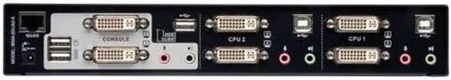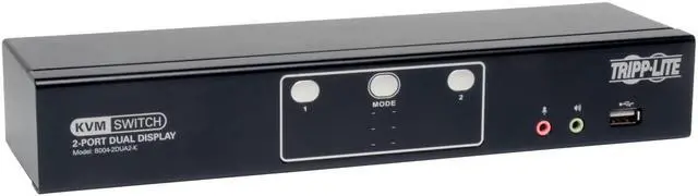 Tripp Lite's B004-2DUA2-K 2-Port Dual Monitor KVM switch allows for the control of 2 computers with Dual Head DVI video cards via a single set of keyboard, mouse, and dual displays. Built-in USB 2.0 and 3.5 mm. Mini Stereo ports provide added functionality, allowing you to share USB peripherals (flash drive, web cam, powered USB hub, etc.), Speakers (2.1 stereo sound), and Microphone amongst the connected computers. Switch between the connected computers using the front panel pushbuttons, keyboard hotkey commands, or a function that allows for switching via the scroll wheel on your mouse. Switch the KVM, USB, and Audio functionality all at the same time, or separately. KVM control can be fixed on one computer, while the USB 2.0 hub and/or Audio functionality is fixed on another. Set-up is quick and simple, with no software to install, and KVM cables included, so you're ready to go right out of the box. The B004-2DUA2-K is the perfect solution for CAD/CAM and Graphic designers; Medical, Educational and Financial institutions; and High-End gaming. Its DVI-I connectors support both Dual Link digital resolutions up to 2560 x 1600, and analog resolutions up to 2048 x 1536. Connect a VGA monitor or computer port by using a P556-Series DVI to VGA adapter cable instead of the included DVI-D cables. Regardless of whether you use DVI or VGA, the KVM stores the EDID (Extended Display Identification Data) of the connected monitors, which ensures optimal display resolution and prevents any delay or change in video resolution when switching between or booting computers. This full time DDC support provides the necessary EDID information for optimal performance on Windows 7 and other operating systems. If you have the need for more than two monitors, the KVM's Quad-View Mode allows for computers with 3- or 4-head video cards to share KVM, audio and USB peripherals by connecting 2 Dual Display/Monitor KVM switches together. All major operating systems are supported.