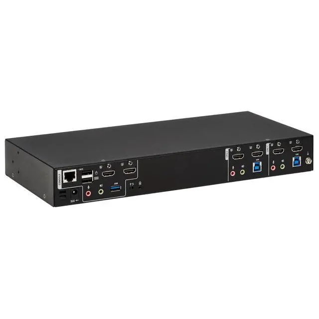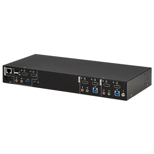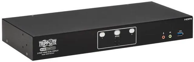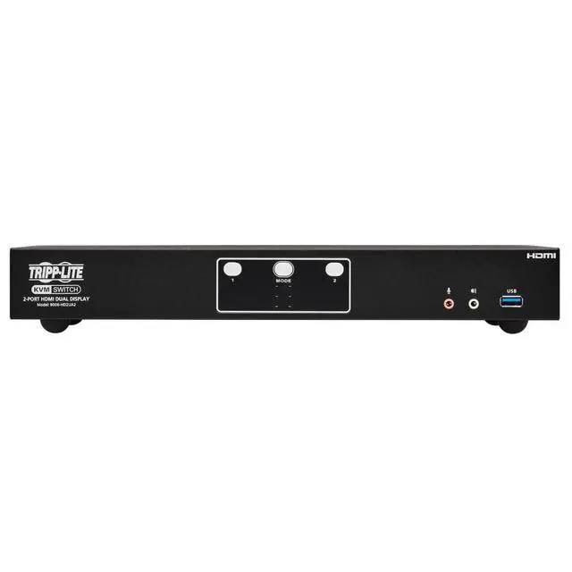 CONNECTS TWO COMPUTERS TO TWO 4K MONITORS AND A SINGLE KEYBOARD/MOUSE: This dual-monitor KVM switch lets you access, control, boot and reboot two computers or other devices with HDMI ports and switch back and forth between them. It's ideal for work-from-home applications in which you'd like to share two monitors between your home and work computers. Both computers share two HDMI 4K monitors and one USB keyboard/mouse, which saves space on your desk or workspace. SWITCHING BETWEEN COMPUTERS IS FAST AND EASY: Use the front-panel push buttons, hotkey commands, mouse movement, RS-232 commands or the included remote port selector for quick and easy toggling between computers. You can also use the Auto Scan feature to scan all connected computers in five-second intervals automatically. LEDs indicate which computer is currently selected. TRANSMITS CRYSTAL-CLEAR 4K VIDEO WITH DIGITAL AUDIO: The B006-HD2UA2 supports video resolutions up to 4K UHD (3840 x 2160 @ 60 Hz) and 4K DCI (4096 x 2160 @ 60 Hz) on two HDMI monitors, as well as 2.1-channel surround sound for music, movies and games. Independent audio switching lets you listen to music or a podcast on one computer, while simultaneously working on a second computer. Front-panel audio jacks have priority over the rear-panel jacks. A DCC (Daisy Chain Control) port lets you connect two B006-HD2UA2 KVM switches for a quad-display installation. USB HUB LETS YOU SHARE PERIPHERALS BETWEEN COMPUTERS: Two USB 3.2 Gen 1 hub ports allow you to share USB peripherals, such as printers, hard drives, scanners, webcams and flash drives, between all connected computers. This lets you avoid the expense and clutter of separate USB hubs. The USB-A ports support data transfer speeds up to 5 Gbps and are backward compatible with previous USB generations. DESIGNED FOR CONVENIENT MOUNTING WITH INCLUDED BRACKETS: The heavy-duty metal housing can be placed on a desktop or other level surface that can safely support the weight of the KVM switch and attached cables. It can also be mounted at the front or rear of a standard 19-inch rack with user-supplied hardware. The included DC power supply connects to any standard AC power source.
