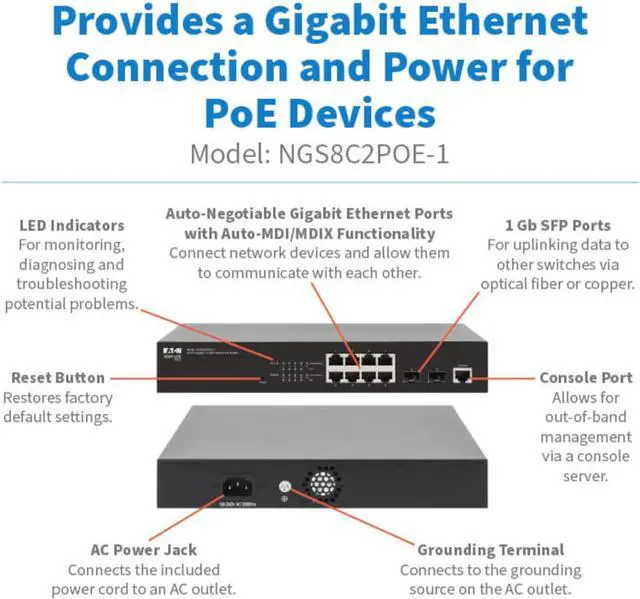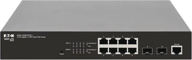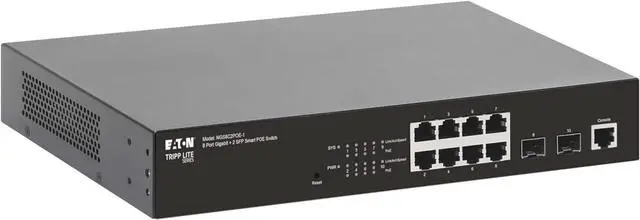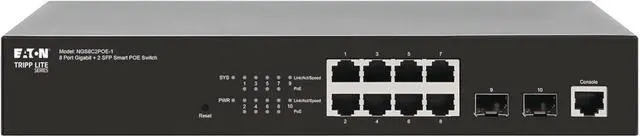 Eaton Tripp Lite Series 8Port Gigabit Managed PoE+ Switch with 2 SFP Ports, Easy Smart WebManaged Layer 2 Ethernet Splitter, 140W, 1 Gbps, 1U Rack Mount or Desktop, 3Year Warranty (NGS8C2POE-1)