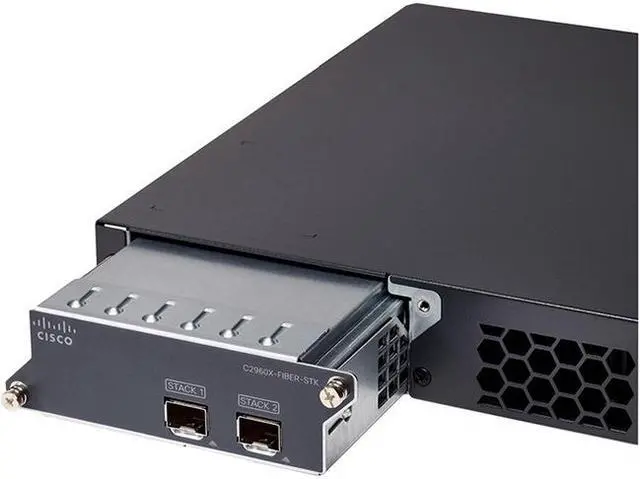 The module allows stacking over SFP+ ports and provides stacking bandwidth of up to 40 Gpbs over longer distance. It can be used to stack switches across wiring closets on different floors of a building or across different buildings in a campus. The FlexStack extended fiber module has two SFP+ ports. The SFP+ transceivers supported on these ports are listed in the compatibility matrix. Choose appropriate SFP+ transceivers based on the distance required between switches. Stacking topologies with FlexStack extended fiber modules Individual Cisco Catalyst 2960-X or 2960-XR Series Switches spread across multiple wiring closets on different floors of a building or in different buildings of a campus can be stacked with the FlexStack extended fiber modules.