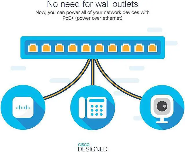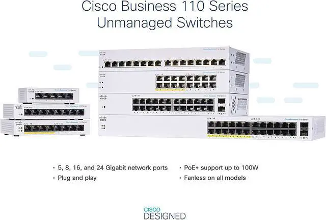 The Cisco Business 110 Series Unmanaged Switches are affordable, plug-and-play entry-level switches that provide gigabit Ethernet switching with key features like Power over Ethernet (PoE), energy efficiency, and traffic prioritization for a fast and resilient small business network.