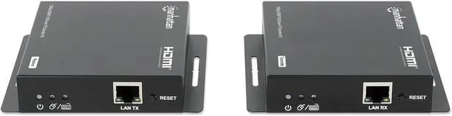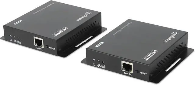 The Manhattan HDMI KVM over IP 1080p Extension Kit allows you to access any computer (or other HDMI source) from the keyboard, mouse and monitor up to 120 m (394 ft). You can make a direct connection via a single RJ45 Ethernet cable (Cat6 or higher recommended for maximum range and performance), or connect it to an existing network switch to exceed distance limits.