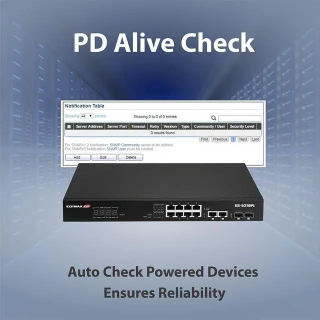 AUTO-REBOOT of PD: Auto checks the alive status of PoE powered devices (PD) and reboots if fails to respond to enhance the reliability of the network and devices.